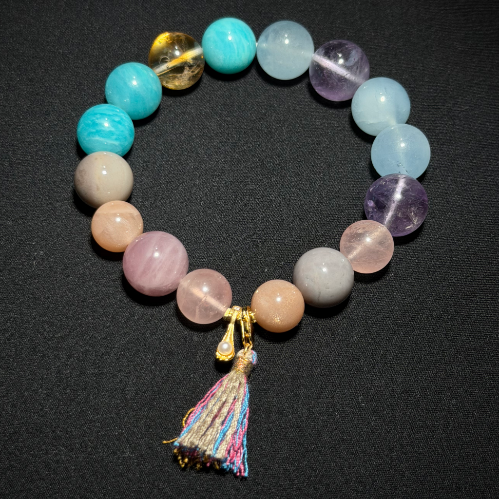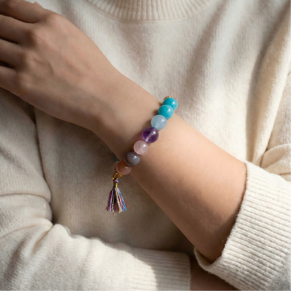 Natural crystal beaded bracelet featuring teal Amazonite, pale blue Aquamarine, and Gray Flash Spirit Moonstone with a tassel charm on a black background. Healing jewelry for Throat Chakra and anxiety relief.Calming Tides Crystal Bracelet Ocean Serenity 5-Element Bracelet The Harmony Flow Bracelet
